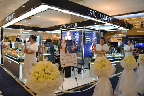 剪彩現(xiàn)場,禮儀小姐為顧客展示雅詩蘭黛明星產(chǎn)品