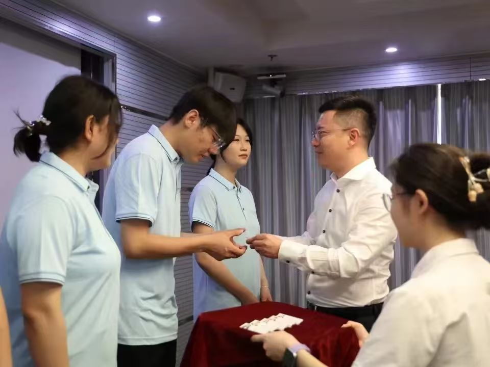 伴隨著激昂的音樂,入職儀式進(jìn)入了發(fā)放工牌的環(huán)節(jié)。國(guó)芳集團(tuán)各位領(lǐng)導(dǎo)面帶微笑,將蘊(yùn)含著公司信任與期望的工牌并伴手禮交到新員工手上,工牌在燈光的照耀下,折射出他們堅(jiān)定的信念和對(duì)新征程的信心。